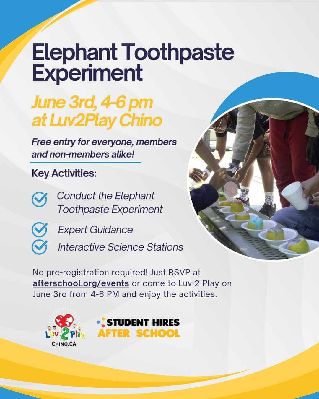Luv 2 Play Chino 3983 Grand Ave, Chino, CA, United StatesJoin us at Luv 2 Play for an explosive day of scientific discovery! Our Elephant Toothpaste Experiment event invites families to dive into the exciting world of chemical reactions in a playful and educational setting. This event is completely free for all Luv 2 Play members and open to the public at no cost. Key […]